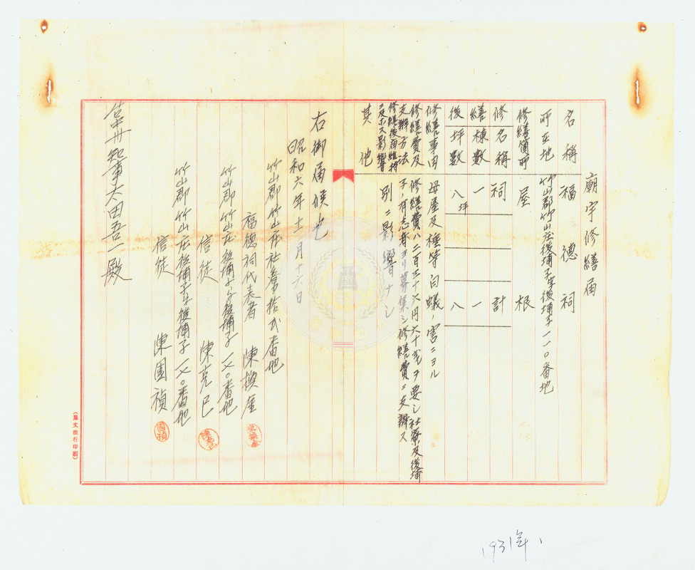 | 題名: | 昭和六年信徒陳克己、陳國楨竹山郡竹山庄福德祠及開漳聖王廟廟宇修繕 |